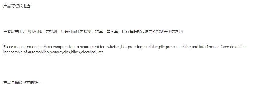 主要应用于:热压机械压力检测、压装机械压力检测、汽车、摩托车、自行车装配过盈力的检测等测力场所